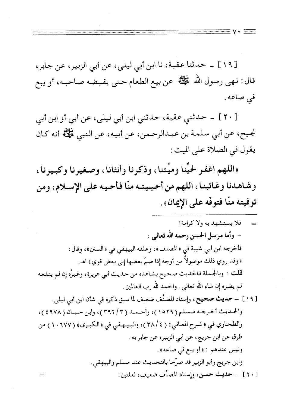 20 - حدثني عقبة حدثني ابن أبي ليلى عن أبي أو ابن أبي نجيح عن أبي سلمة بن عبد الرحمن عن أبيه عن النبي صلى الله عليه وسلم أنه كان يقول في الصلاة على الميت اللهم اغفر لحينا وميتنا وذكرنا وأنثانا وصغيرنا وكبيرنا وشاهدنا وغائبنا اللهم من أحييته منا فأحيه على الإسلام ومن توفيته منا فتوفه على الإيمان
