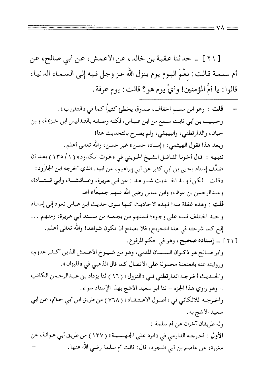 21 - حدثنا عقبة بن خالد عن الأعمش عن أبي صالح عن أم سلمة قالت نعم اليوم يوم ينزل الله عز وجل فيه إلى السماء الدنيا قالوا يا أم المؤمنين وأي يوم هو قالت يوم عرفة