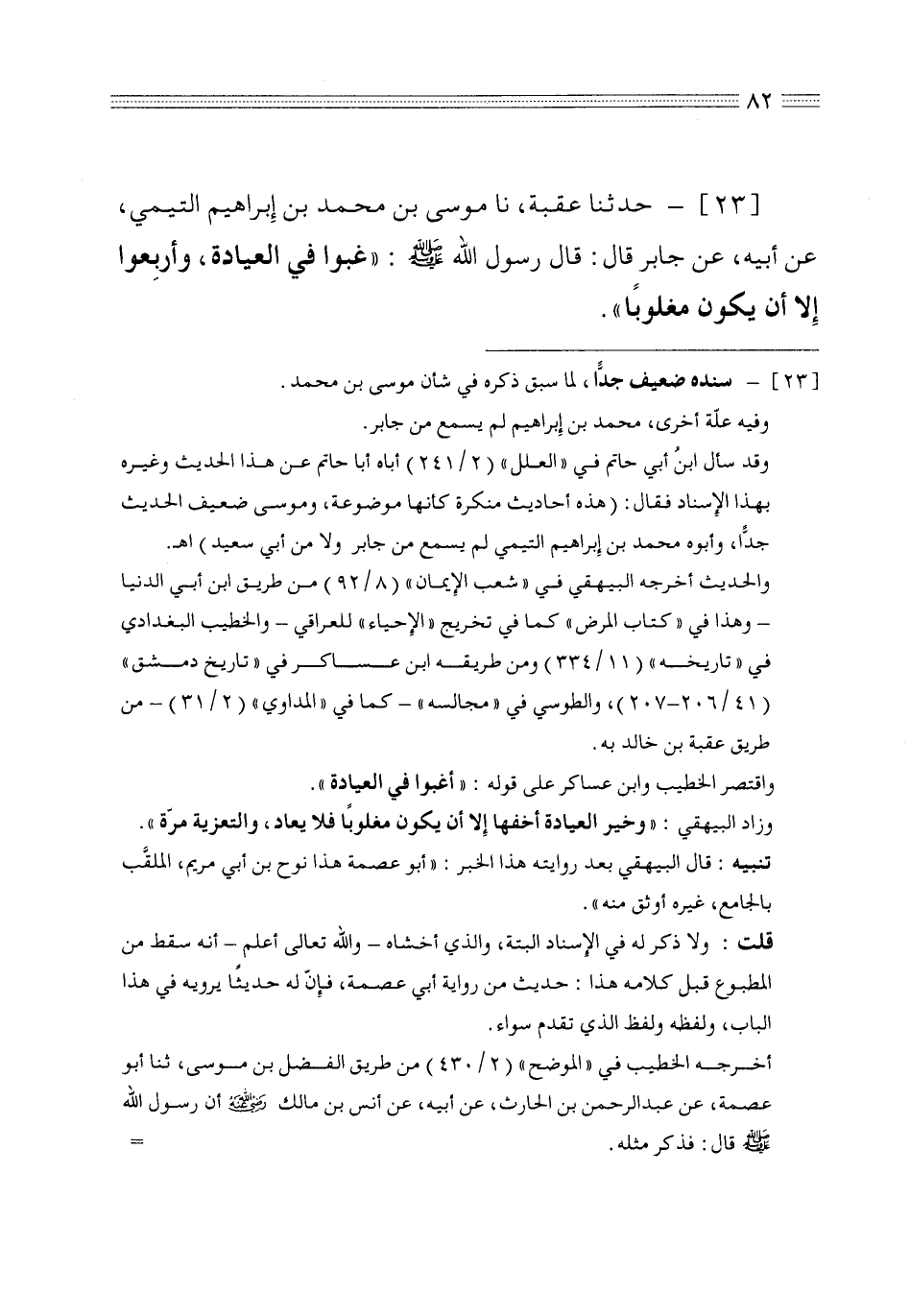 23 - حدثنا عقبة نا موسى بن محمد بن إبراهيم التيمي عن أبيه عن جابر قال قال رسول الله صلى الله عليه وسلم غبوا في العيادة وأربعوا إلا أن يكون مغلوباً