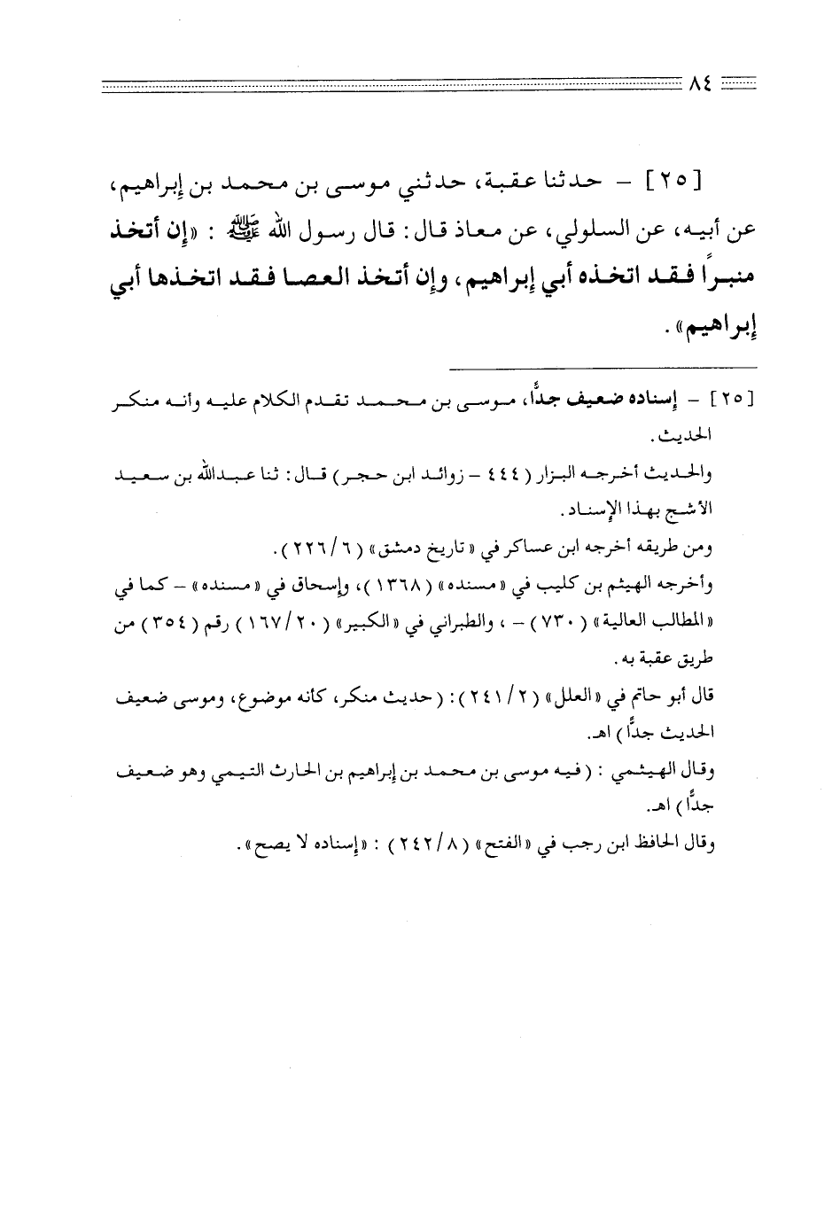 25 - حدثنا عقبة حدثني موسى بن محمد بن إبراهيم عن أبيه عن السلولي عن معاذ قال قال رسول الله صلى الله عليه وسلم إن أتخذ منبراً فقد اتخذه أبي إبراهيم وإن أتخذ العصا فقد اتخذها أبي إبراهيم
