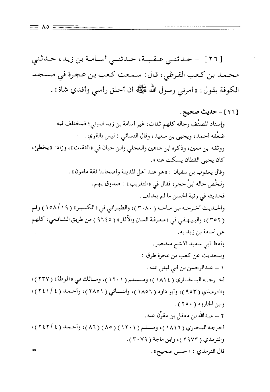 26 - حدثني عقبة حدثني أسامة بن زيد حدثني محمد بن كعب القرظي قال سمعت كعب بن عجرة في مسجد الكوفة يقول أمرني رسول الله صلى الله عليه وسلم أن أحلق رأسي وأفدي شاة