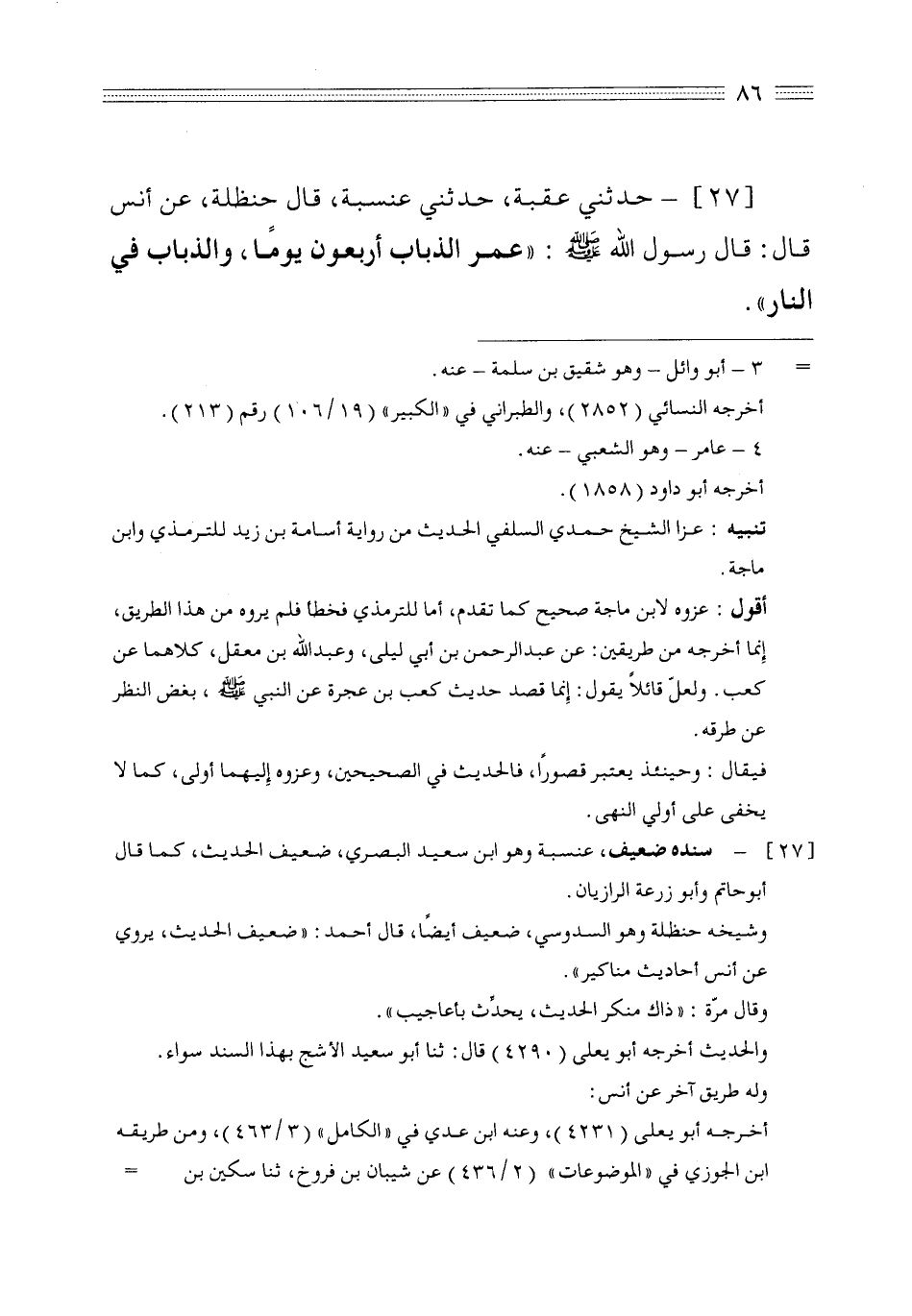 27 - حدثني عقبة حدثني عنبسة قال حنظلة عن أنس قال قال رسول الله صلى الله عليه وسلم عمر الذباب أربعون يوماً والذباب في النار