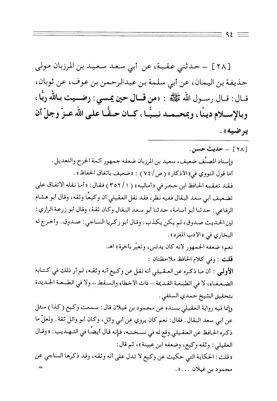 28 - حدثني عقبة عن أبي سعد سعيد بن المرزبان مولى حذيفة بن اليمان عن أبي سلمة بن عبد الرحمن بن عوف عن ثوبان قال قال رسول الله صلى الله عليه وسلم من قال حين يمسي رضيت بالله رباً، وبالإسلام ديناً وبمحمد نبياً كان حقاً على الله عز وجل أن يرضيه