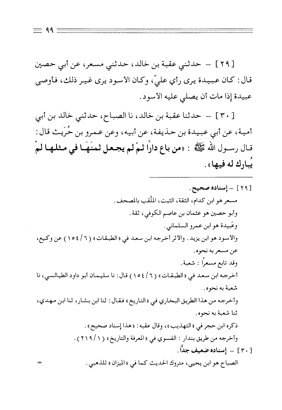 29 - حدثني عقبة بن خالد حدثني مسعر عن أبي حصين قال كان عبيدة يرى رأي علي وكان الأسود يرى غير ذلك فأوصى عبيدة إذا مات أن يصلي عليه الأسود