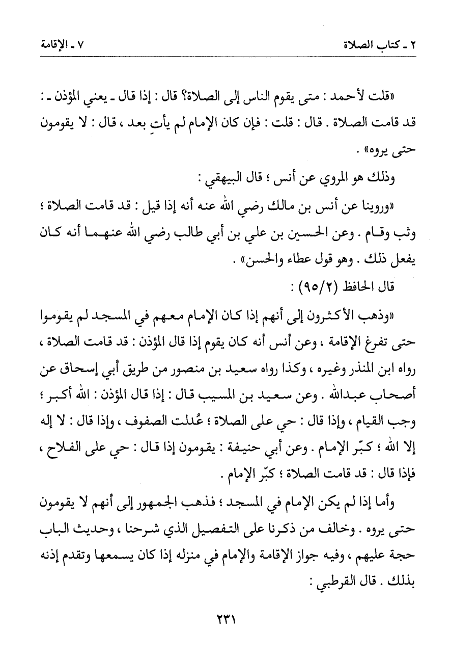 (قلت لأحمد: متى يقوم الناس إلى الصلاة؟ قال: إذا قال - يعني المؤذن -: