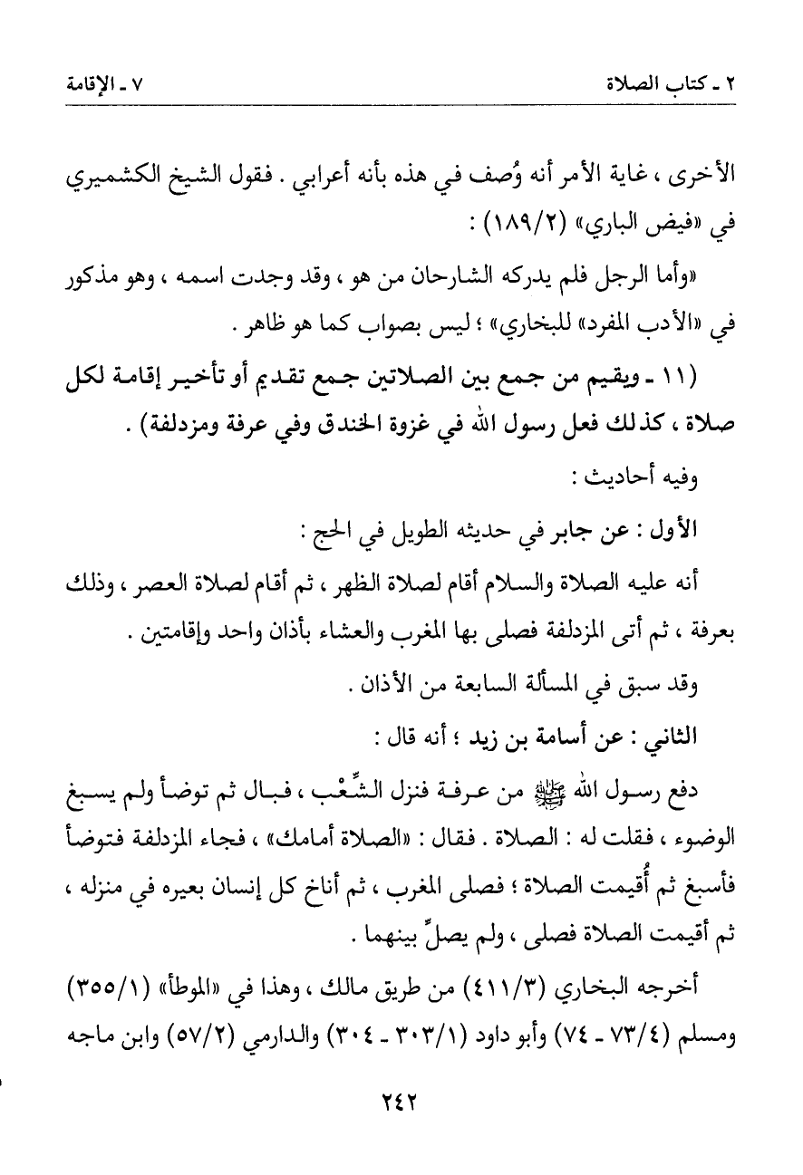 (11 - ويقيم من جمع بين الصلاتين جمع تقديم أو تاخير إقامة لكل صلاة كذلك فعل رسول الله في غزوة الخندق وفي عرفة ومزدلفة)
