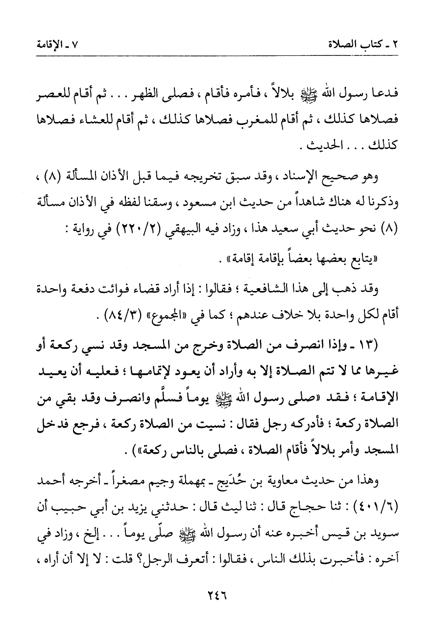 (13 - وإذا انصرف من الصلاة وخرج من المسجد وقد نسي ركعة أو غيرها مما لا تتم الصلاة إلا به وأراد أن يعود لإتمامها فعليه أن يعيد الإقامة فقد (صلى رسول الله صلى الله عليه وسلم يوما فسلم وانصرف وقد بقي من الصلاة ركعة فأدركه رجل فقال: نسيت من الصلاة ركعة فرجع فدخل المسجد وأمر بلالا فأقام الصلاة فصلى بالناس ركعة)
