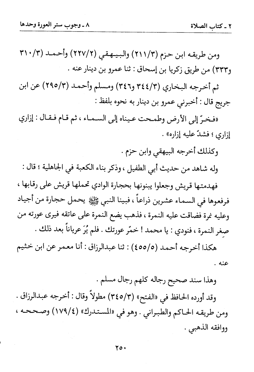 فهدمتها قريش وجعلوا يبنونها بحجارة الوادي تحملها قريش على رقابها فرفعوها في السماء عشرين ذراعا فبينا النبي صلى الله عليه وسلم يحمل حجارة من أجياد وعليه نمرة فضاقت عليه النمرة فذهب يضع النمرة على عاتقه فيرى عورته من صغر النمرة فنودي: يا محمد خمر عورتك. فلم ير عريانا بعد ذلك