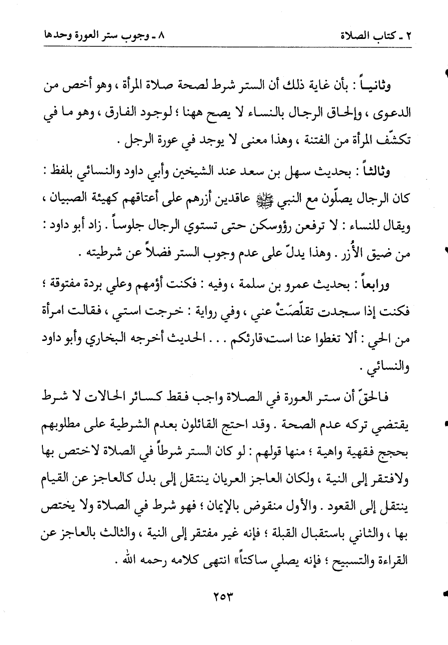 وثالثا: بحديث سهل بن سعد عند الشيخين وأبي داود والنسائي بلفظ: كان الرجال يصلون مع النبي صلى الله عليه وسلم عاقدين أزرهم على أعتاقهم كهيئة الصبيان ويقال للنساء: لا ترفعن رؤوسكن حتى تستوي الرجال جلوسا. زاد أبو داود: من ضيق الأزر. وهذا يدل على عدم وجوب الستر فضلا عن شرطيته