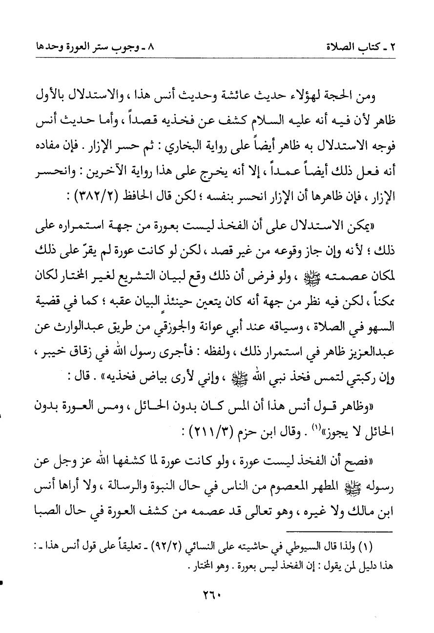 (1) ولذا قال السيوطي في حاشيته على النسائي (2/ 92) - تعليقا على قول أنس هذا -: هذا دليل لمن يقول: إن الفخذ ليس بعورة. وهو المختار