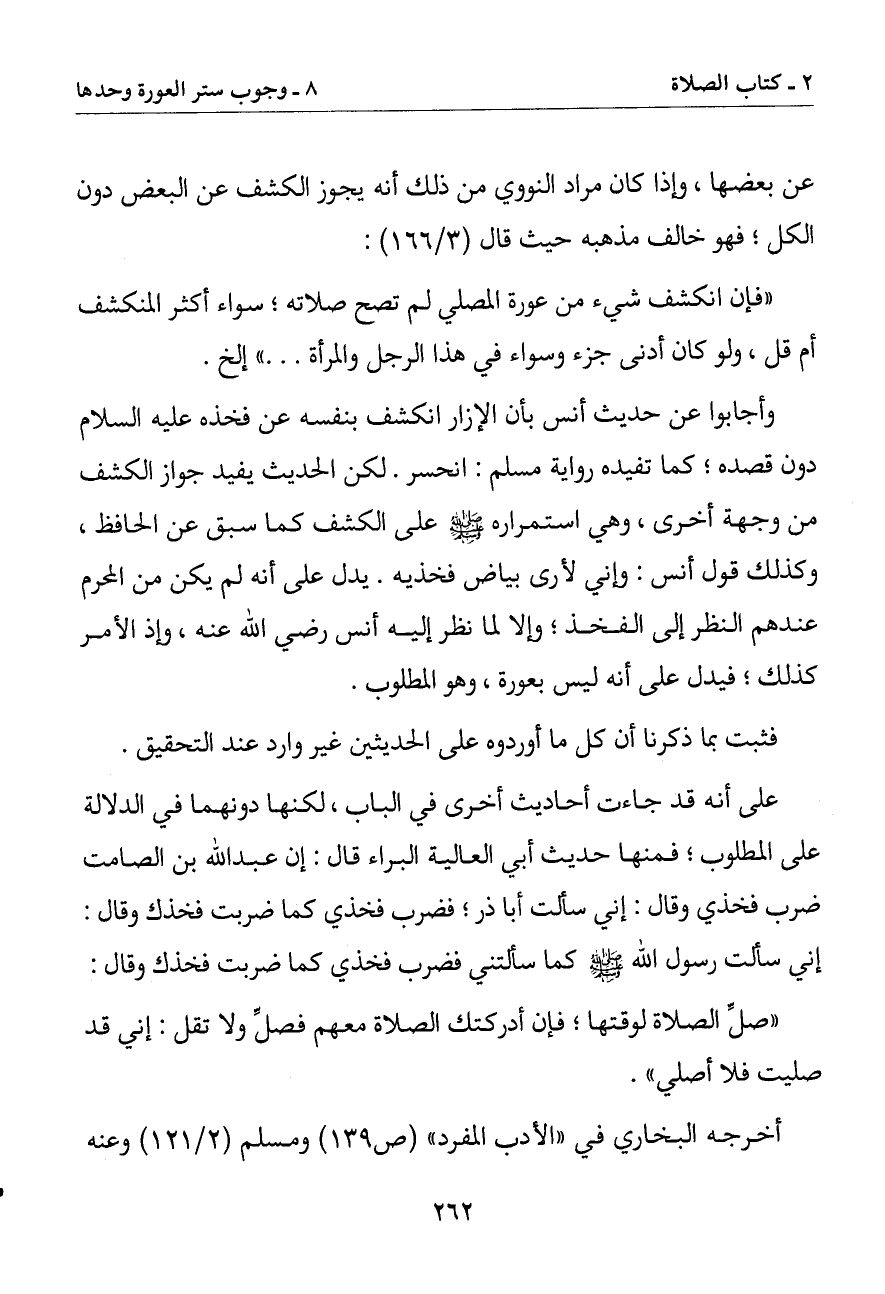 وأجابوا عن حديث أنس بأن الإزار انكشف بنفسه عن فخذه عليه السلام دون قصده كما تفيده رواية مسلم: انحسر. لكن الحديث يفيد جواز الكشف من وجهة أخرى وهي استمراره صلى الله عليه وسلم على الكشف كما سبق عن الحافظ وكذلك قول أنس: وإني لأرى بياض فخذيه. يدل على أنه لم يكن من المحرم عندهم النظر إلى الفخذ وإلا لما نظر إليه أنس رضي الله عنه وإذ الأمر كذلك فيدل على أنه ليس بعورة وهو المطلوب