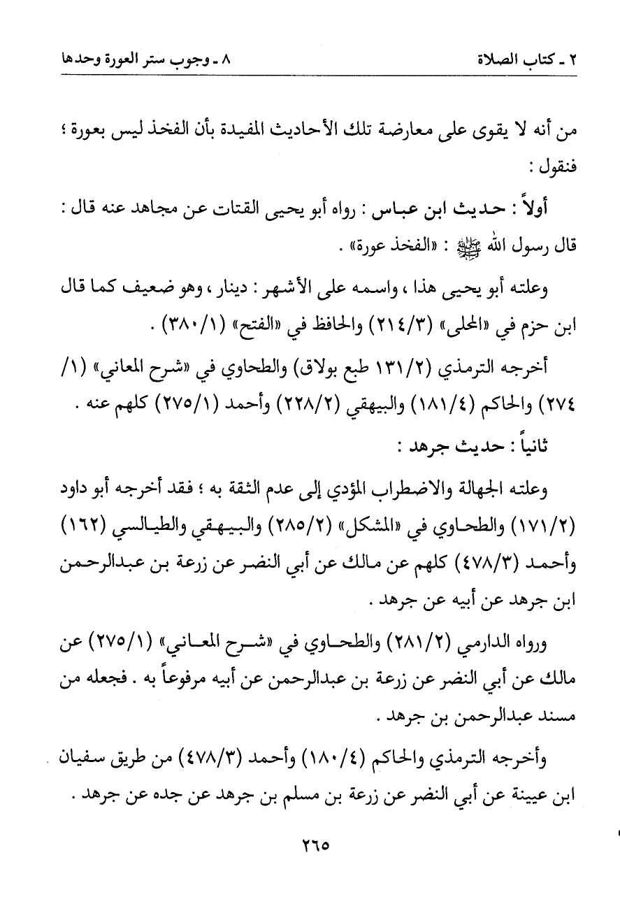 أولا: حديث ابن عباس: رواه أبو يحيى القتات عن مجاهد عنه قال: قال رسول الله صلى الله عليه وسلم: (الفخذ عورة)