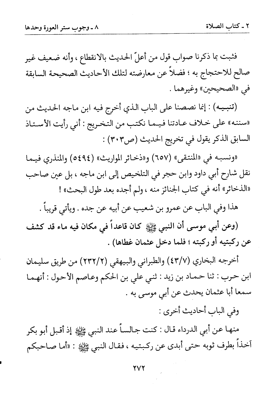 (وعن أبي موسى أن النبي صلى الله عليه وسلم كان قاعدا في مكان فيه ماء قد كشف عن ركبتيه أو ركبتيه فلما دخل عثمان غطاها)