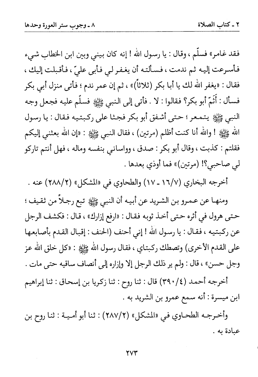 ومنها عن عمرو بن الشريد عن أبيه أن النبي صلى الله عليه وسلم تبع رجلا من ثقيف حتى هرول في أثره حتى أخذ ثوبه فقال: (ارفع إزارك) قال فكشف الرجل عن ركبتيه فقال: يا رسول الله إني أحنف (الحنف: إقبال القدم بأصابعها على القدم الأخرى) (وتصطك ركبتاي فقال رسول الله صلى الله عليه وسلم: (كل خلق الله عز وجل حسن) قال: ولم ير ذلك الرجل إلا وإزاره إلى أنصاف ساقيه حتى مات