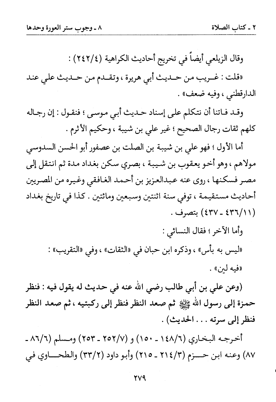 (وعن علي بن أبي طالب رضي الله عنه في حديث له يقول فيه: فنظر حمزة إلى رسول الله صلى الله عليه وسلم ثم صعد النظر فنظر إلى ركبتيه ثم صعد النظر فنظر إلى سرته. . . الحديث)