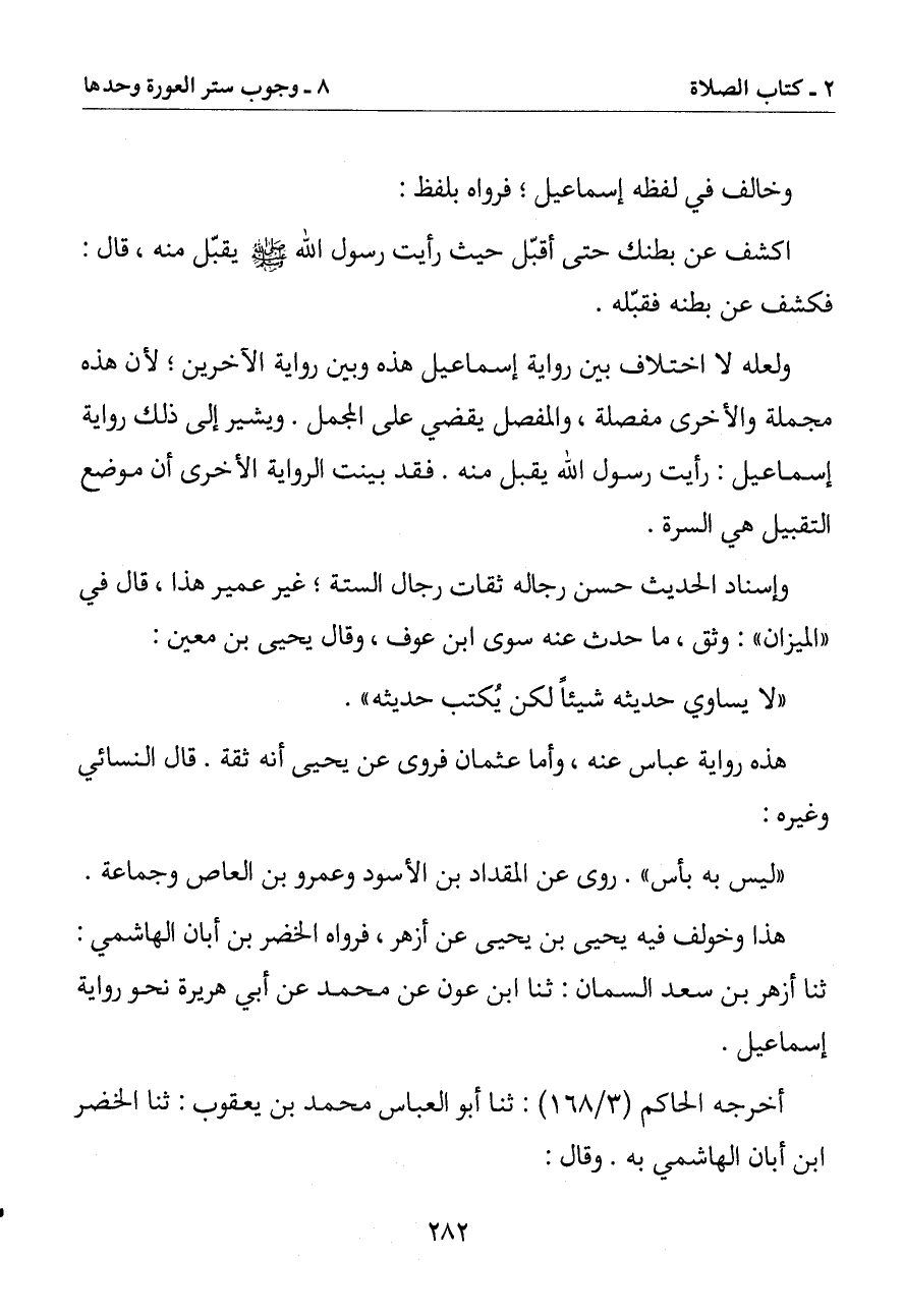 ولعله لا اختلاف بين رواية إسماعيل هذه وبين رواية الآخرين لأن هذه مجملة والأخرى مفصلة والمفصل يقضي على المجمل ويشير إلى ذلك رواية إسماعيل: رأيت رسول الله يقبل منه. فقد بينت الرواية الأخرى أن موضع التقبيل هي السرة