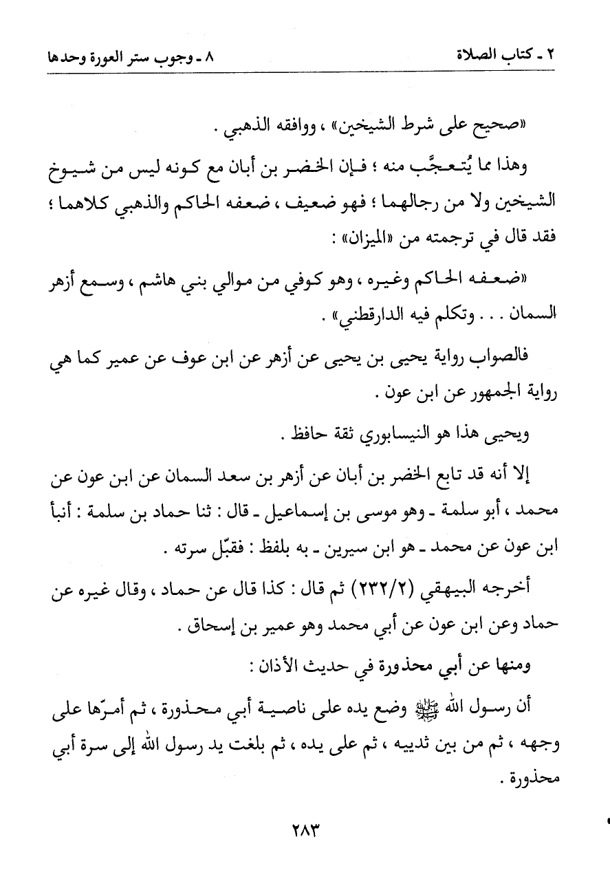 إلا أنه قد تابع الخضر بن أبان عن أزهر بن سعد السمان عن ابن عون عن محمد أبو سلمة - وهو موسى بن إسماعيل - قال: ثنا حماد بن سلمة: أنبأ ابن عون عن محمد - هو ابن سيرين - به لفظ: فقبل سرته
