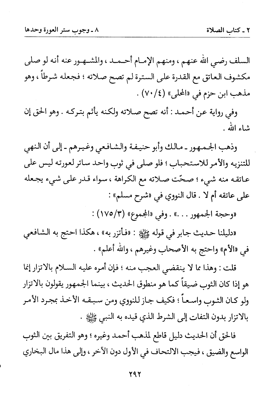 قلت: وهذا ما لا ينقضي العجب منه فإن أمره عليه السلام بالاتزار إنما هو إذا كان الثوب ضيقا كما هو منطوق الحديث بينما الجمهور يقولون بالاتزار ولو كان الثوب واسعا فكيف جاز للنووي ومن سبقه الأخذ بمجرد الأمر بالاتزار بدون التفات إلىالشرط الذي قيده به النبي صلى الله عليه وسلم