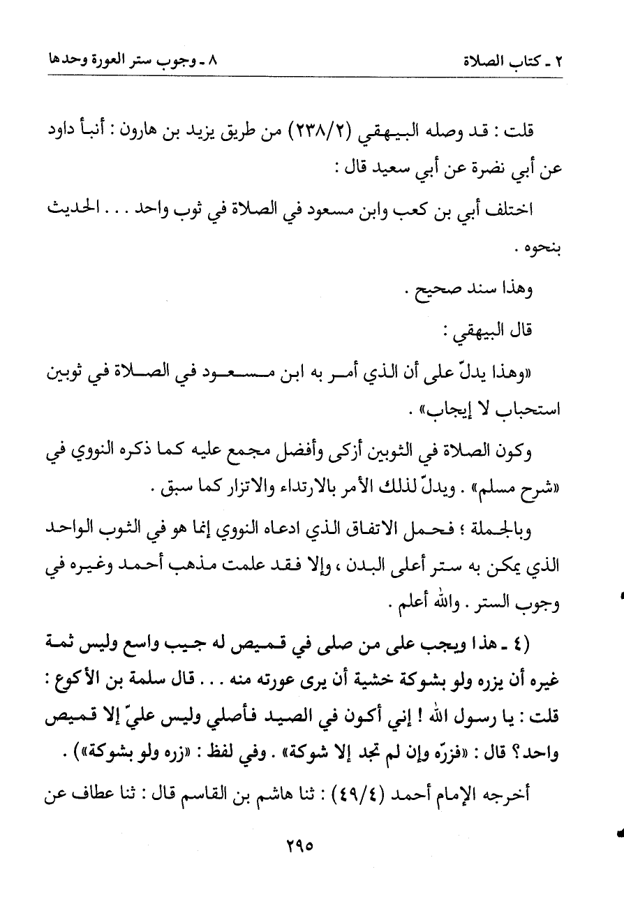 (4 - هذا ويجب على من صلى في قميص له جيب واسع وليس ثمة غيره أن يزره ولو بشوكة خشية أن يرى عورته منه. . . قال سلمة بن الأكوع: قلت: يا رسول الله إني أكون في الصيد فاصلي وليس علي إلا قميص واحد؟ قال: (فزره وإن لم تجد إلا شوكة). وفي لفظ: (زره ولو بشوكة)