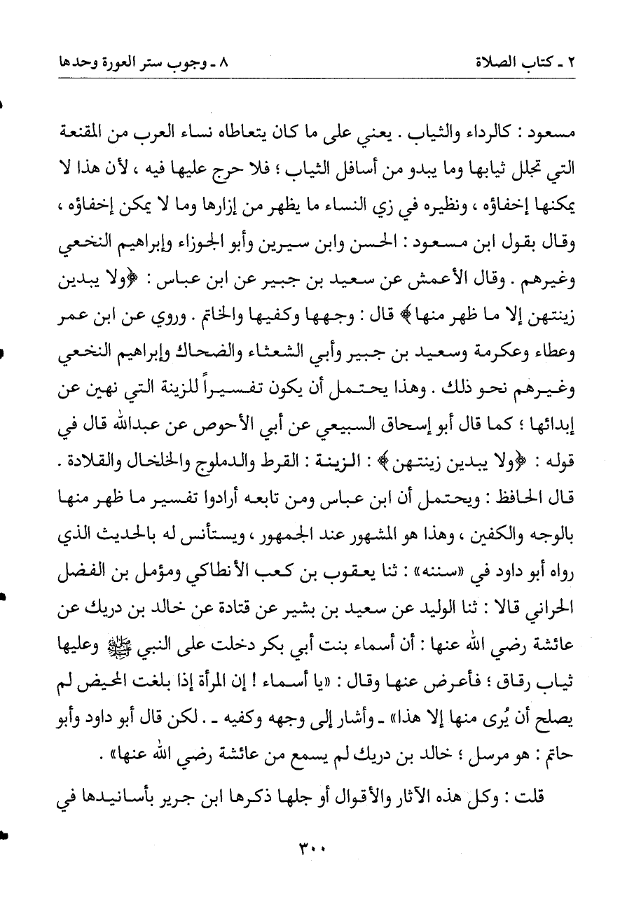 مسعود: كالرداء والثياب. يعني على ما كان يتعاطاه نساء العرب من المقنعة التي تجلل ثيابها وما يبدو من أسافل الثياب فلا حرج عليها فيه لأن هذا لا يمكنها إخفاؤها ونظيره في زي النساء ما يظهر من إزارها وما لا يمكن إخفاؤه وقال بقول ابن مسعود: الحسن وابن سيرين وأبو الجوزاء وإبراهيم النخعي وغيرهم. وقال الأعمش عن سعيد بن جبير عن ابن عباس: {ولا يبدين زينتهن إلا ما ظهر منها} قال: وجهها وكفيها والخاتم. وروي عن ابن عمر وعطاء وعكرمة وسعيد بن جبير وأبي الشعثاء والضحاك وإبراهيم النخعي وغيرهم نحو ذلك. وهذا يحتمل أن يكون تفسيرا للزينة التي نهين عن إبدائها كما قال أبو إسحاق السبيعي عن أبي الأحوص عن عبد الله قال في قوله: {ولا يبدين زينتهن}: الزينة: القرط والدملوج والخلخال والقلادة. قال الحافظ: ويحتمل أن ابن عباس ومن تابعه أرادوا تفسير ما ظهر منها بالوجه والكفين وهذا هو المشهور عند الجمهور ويستأنس له بالحديث الذي رواه أبو داود في (سننه): ثنا يعقوب بن كعب الأنطاكي ومؤمل بن الفضل الحراني قالا: ثنا الوليد عن سعيد بن بشير عن قتادة عن خالد بن دريك عن عائشة رضي الله عنها: أن أسماء بنت أبي بكر دخلت على النبي صلى الله عليه وسلم وعليها ثياب رقاق فأعرض عنها وقال: (يا أسماء إن المرأة إذا بلغت المحيض لم يصلح أن يرى منها إلا هذا) - وأشار إلى وجهه وكفيه -. لكن قال أبو داود وأبو حاتم: هو مرسل خالد بن دريك لم يسمع من عائشة رضي الله عنها)