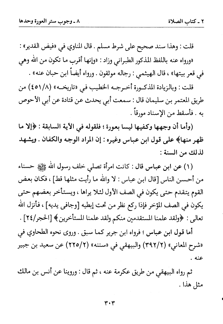 (وأما أن وجهها وكفيها ليسا بعورة فلقوله في الآية السابقة: {إلا ما ظهر منها} على قول ابن عباس وغيره: إن المراد الوجه والكفان. ويشهد لذلك من السنة: