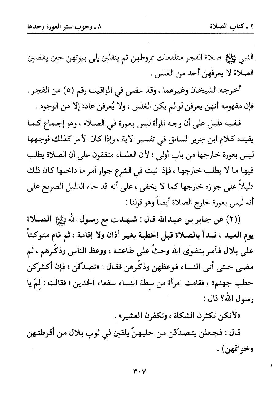 ففيه دليل على أن وجه المرأة ليس بعورة في الصلاة وهو إجماع كما يفيده كلام ابن جرير السابق في تفسير الآية وإذا كان الأمر كذلك فوجهها ليس بعورة خارجها من باب أولى لأن العلماء متفقون على أن الصلاة يطلب فيها ما لا يطلب خارجها فإذا ثبت في الشرع جواز أمر ما داخلها كان ذلك دليلا على جوازه خارجها كما لا يخفى على أنه قد جاء الدليل الصريح على أنه ليس بعورة خارج الصلاة أيضا وهو قولنا: