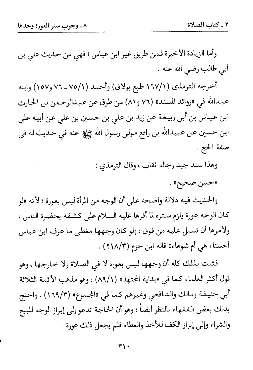 فثبت بذلك كله أن وجهها ليس بعورة لا في الصلاة ولا خارجها وهو قول أكثر العلماء في (بداية المجتهد) وهو مذهب الأئمة الثلاثة أبي حنيفة ومالك والشافعي وغيرهم كما في (المجموع). واحتج بذلك بعض الفقهاء بالنظر أيضا وهو أن الحاجة تدعو إلى إبراز الوجه للبيع والشراء وإلى إبراز الكف للأخذ والعطاء فلم يجعل ذلك عورة