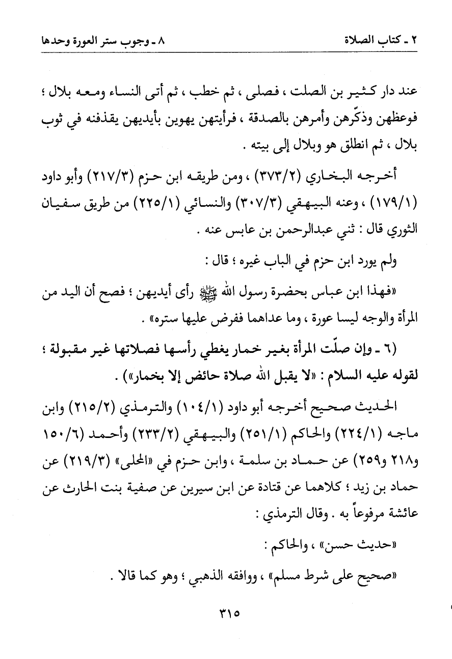 (6 - وإن صلت المرأة بغير خمار يغطي رأسها فصلاتها غير مقبولة لقوله عليه السلام: (لا يقبل الله صلاة حائض إلا بخمار)