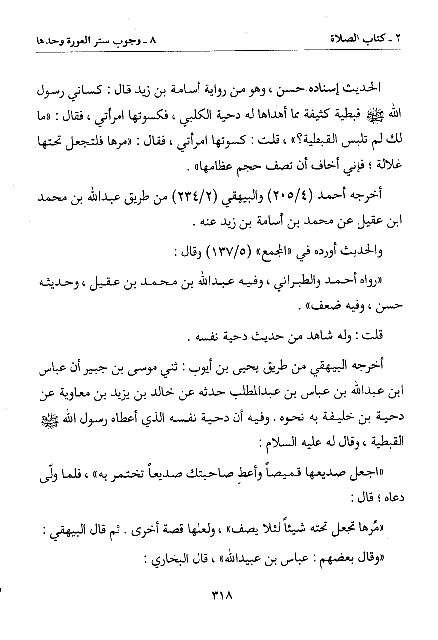 الحديث إسناده حسن وهو من روياة أسامة بن زيد قال: كساني رسول الله صلى الله عليه وسلم قبطية كثيفة مما أهداها له دحية الكلبي فكسوتها امرأتي فقال: (ما لك لم تلبس القبطية؟) قلت: كسوتها امرأتي فقال: (مرها فلتجعل تحتها غلالة فإني أخاف أن تصف حجم عظامها)