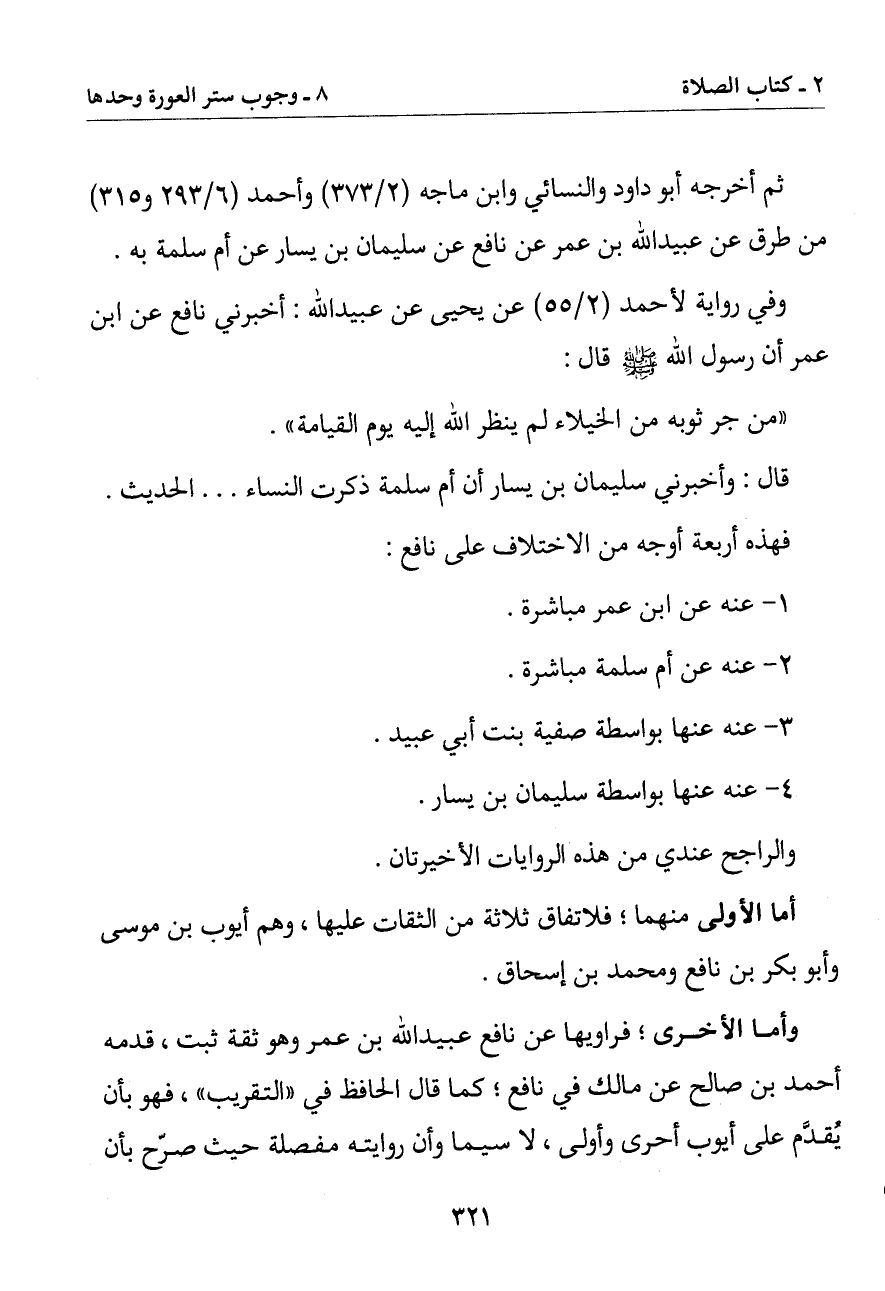 وأما الأخرى فراويها عن نافع عبيد الله بن عمر وهو ثقة ثبت قدمه أحمد بن صالح عن مالك في نافع كما قال الحافظ في (التقريب) فهو بأن يقدم على أيوب أحرى وأولى لا سيما وأن روايته مفصلة حيث صرح بأن