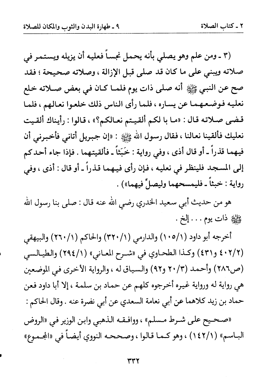 (3 - ومن علم وهو يصلي بأنه يحمل نجسا فعليه أن يزيله ويستمر في صلاته ويبني على ما كان قد صلى قبل الإزالة وصلاته صحيحة فقد صح عن النبي صلى الله عليه وسلم أنه صلى ذات يوم فلما كان في بعض صلاته خلع نعليه فوضعهما عن يساره فلما رأى الناس ذلك خلعوا نعالهم فلما قضى صلاته قال: (ما بالكم ألقيتم نعالكم؟) قالوا: رأيناك ألقيت نعليك فألقينا نعالنا فقال رسول الله صلى الله عليه وسلم: (إن جبريل أتاني فأخبرني أن فيهما قذرا - أو قال أذى وفي رواية: خبثا - فألقيتهما. فإذا جاء أحدكم إلى المسجد فلينظر في نعليه فإن رأى فيهما قذرا - أو قال: أذى وفي رواية: خبثا - فليمسحها وليصل فيهما)