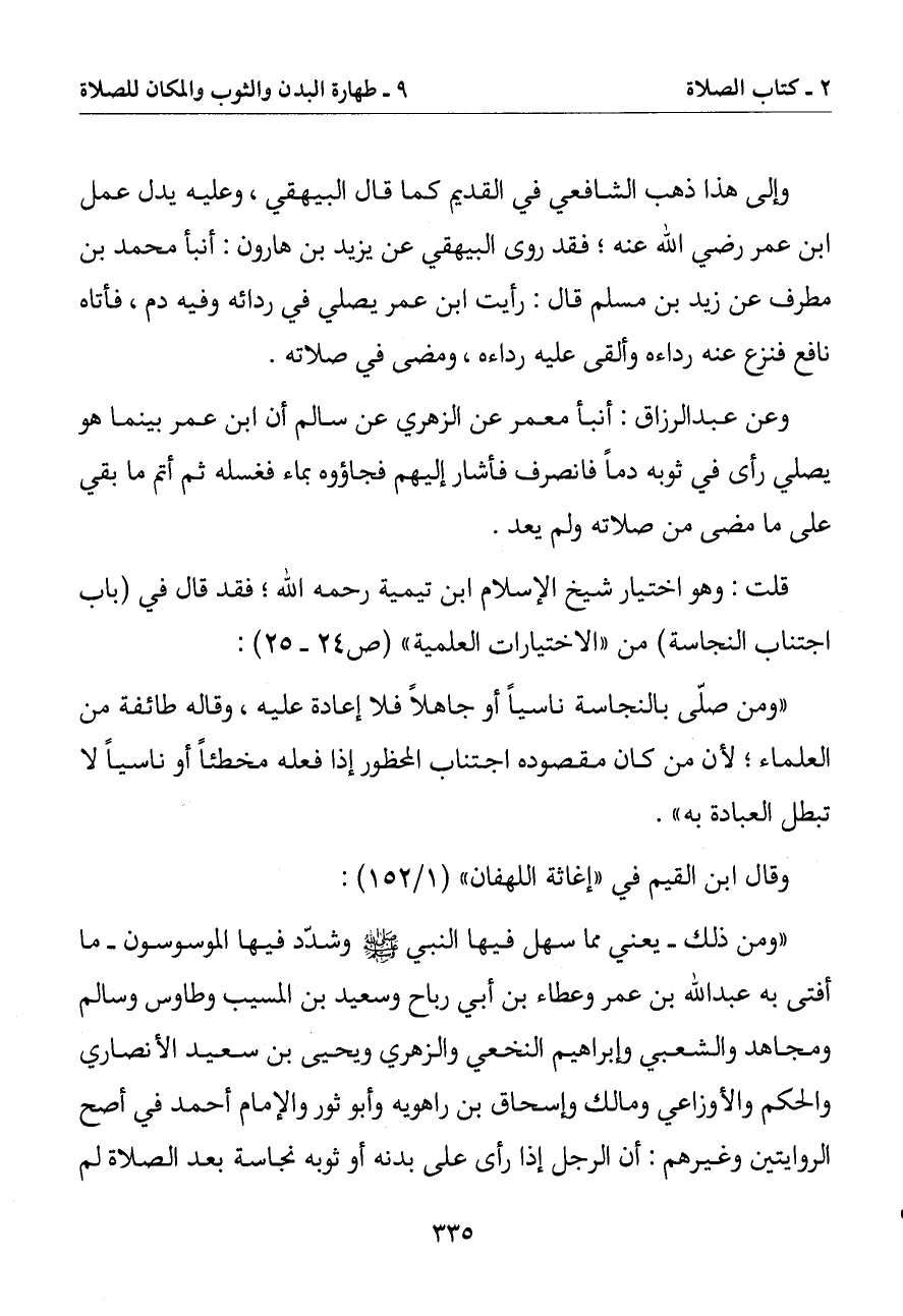 وإلى هذا ذهب الشافعي في القديم كما قال البيهقي وعليه يدل عمل ابن عمر رضي الله عنه فقد روى البيهقي عن يزيد بن هارون: أنبأ محمد بن مطرف عن زيد بن مسلم قال: رأيت ابن عمر يصلي في ردائه وفيه دم فأتاه نافع فنزع عنه ردائه وألقى عليه رداءه ومضى في صلاته