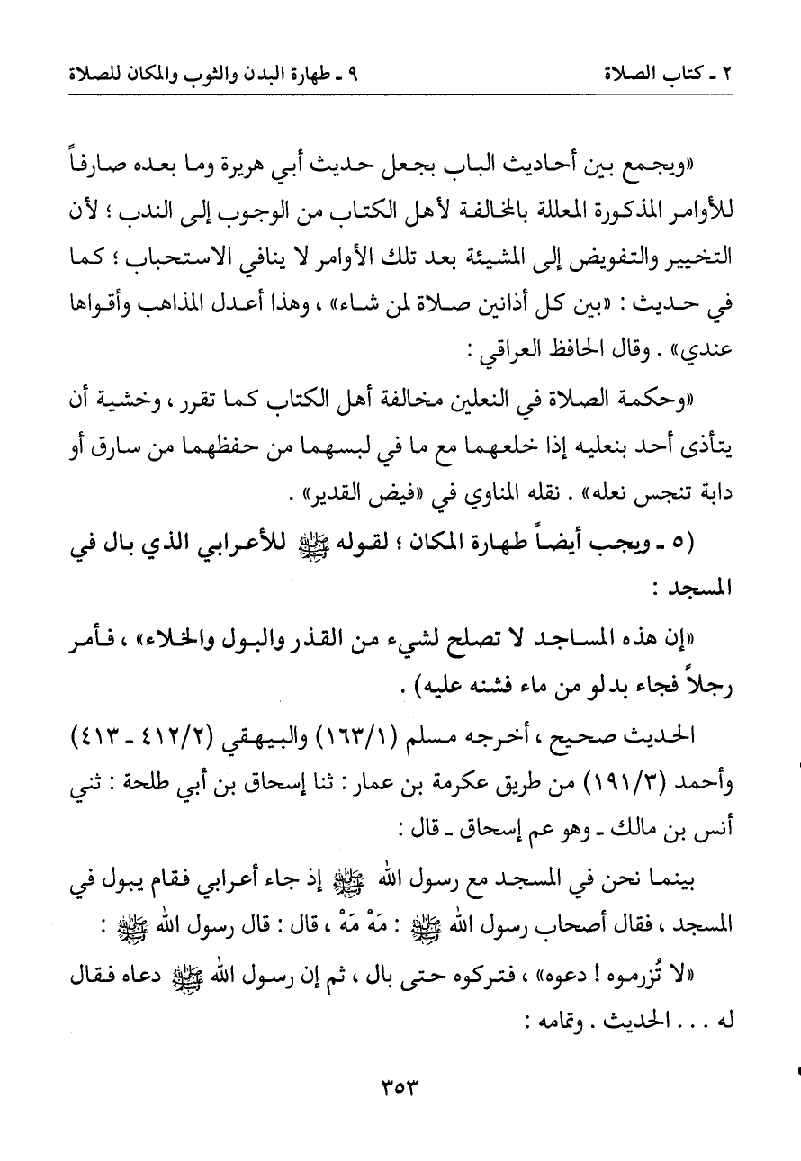 (5 - ويجب أيضا طهارة المكان لقوله صلى الله عليه وسلم للأعرابي الذي بال في المسجد:
