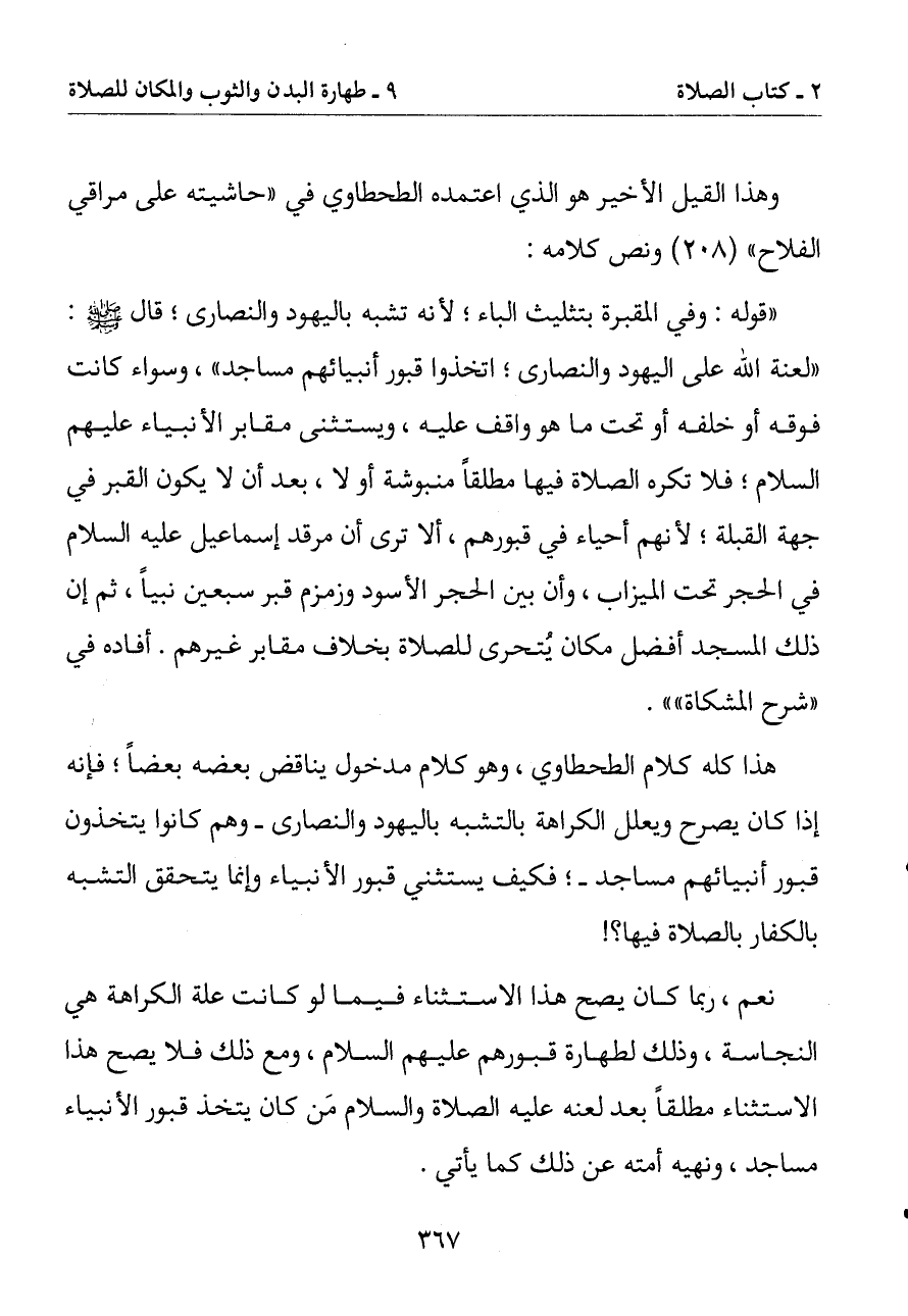 هذا كله كلام الطحطاوي وهو كلام مدخول يناقض بعضه بعضا فإنه إذا كان يصرح ويعلل الكراهة بالتشبه باليهود والنصارى - وهم كانوا يتخذون قبور أنبيائهم مساجد - فكيف يستثني قبور الأنبياء وإنما يتحقق التشبه بالكفار بالصلاة فيها؟