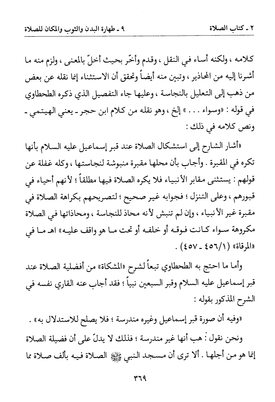 (أشار الشارح إلى استشكال الصلاة عند قبر إسماعيل عليه السلام بأنها تكره في المقبرة. وأجاب بأن محلها مقبرة منبوشة لنجاستها وكله غفلة عن قولهم: يستثنى مقابر الأنبياء فلا يكره الصلاة فيها مطلقا لأنهم أحياء في قبورهم وعلى التنزل فجوابه غير صحيح لتصريحهم بكراهة الصلاة في مقبرة غير الأنبياء وإن لم تنبش لأنه محاذ للنجاسة ومحاذاتها في الصلاة مكروهة سواء كانت فوقه أو خلفه أو تحت ما هو واقف عليه) ا. هـ ما في (المرقاة)