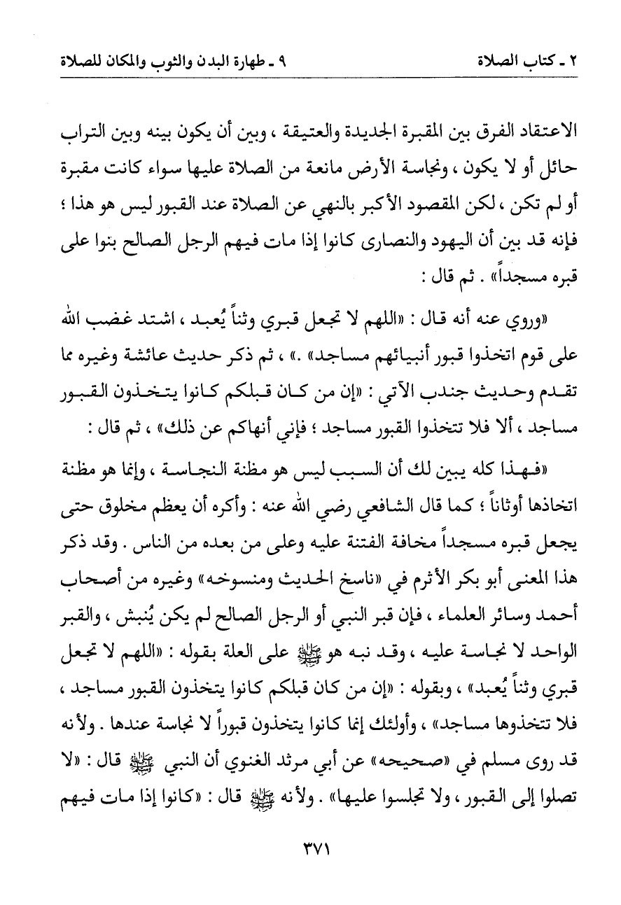 (فهذا كله يبين لك أن السبب ليس هو مظنة النجاسة وإنما هو مظنة اتخاذها أوثانا كما قال الشافعي رضي الله عنه: وأكره أن يعظم مخلوق حتى يجعل قبره مسجدا مخافة الفتنة عليه وعلى من بعده من الناس. وقد ذكر هذا المعنى أبو بكر الأثرم في (ناسخ الحديث ومنسوخه) وغيره من أصحاب أحمد وسائر العلماء فإن قبر النبي صلى الله عليه وسلم أو الرجل الصالح لم يكن ينبش والقبر الواحد لا نجاسة عليه وقد نبه هو صلى الله عليه وسلم على العلة بقول: (اللهم لا تجعل قبري وثنا يعبد) وبقوله: (إن من كان قبلكم كانوا يتخذون القبور مساجد فلا تتخذوها مساجد) وأولئك إنما كانوا يتخذون قبورا لا نجاسة عندها ولأنه قد روى مسلم في (صحيحه) عن أبي مرثد الغنوي أن النبي صلى الله عليه وسلم قال: (لا تصلوا إلى القبور ولا تجلسوا عليها). ولأنه صلى الله عليه وسلم قال:
