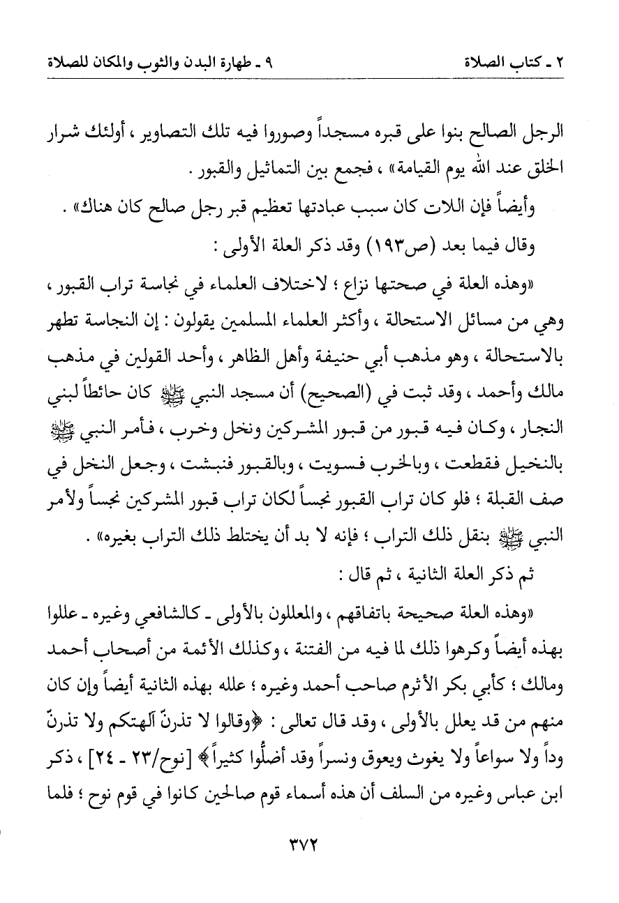 (وهذه العلة صحيحة باتفاقهم والمعللون بالأولى - كالشافعي وغيره - عللوا بهذه أيضا وكرهوا ذلك لما فيه من الفتنة وكلك الأئمة من أصحاب أحمد ومالك كأبي بكر الأثرم صاحب أحمد وغيره علل بهذه الثانية أيضا وإن كان منهم من قد يعلل بالأولى وقد قال تعالى: {وقالوا لا تذرن آلهتكم ولا تذرن ودا ولا سواعا ولا يغوث ويعوق ونسرا وقد أضلوا كثيرا} [نوح / 23 - 24] ذكر ابن عباس وغيره من السلف أن هذه أسماء قوم صالحين كانوا في قوم نوح فلما