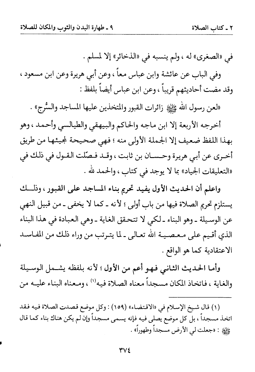 وأما الحديث الثاني فهو أعم من الأول لأنه بلفظه يشمل الوسيلة والغاية فاتخاذ المكان مسجدا معناه الصلاة فيه (1) ومعناه البناء عليه من