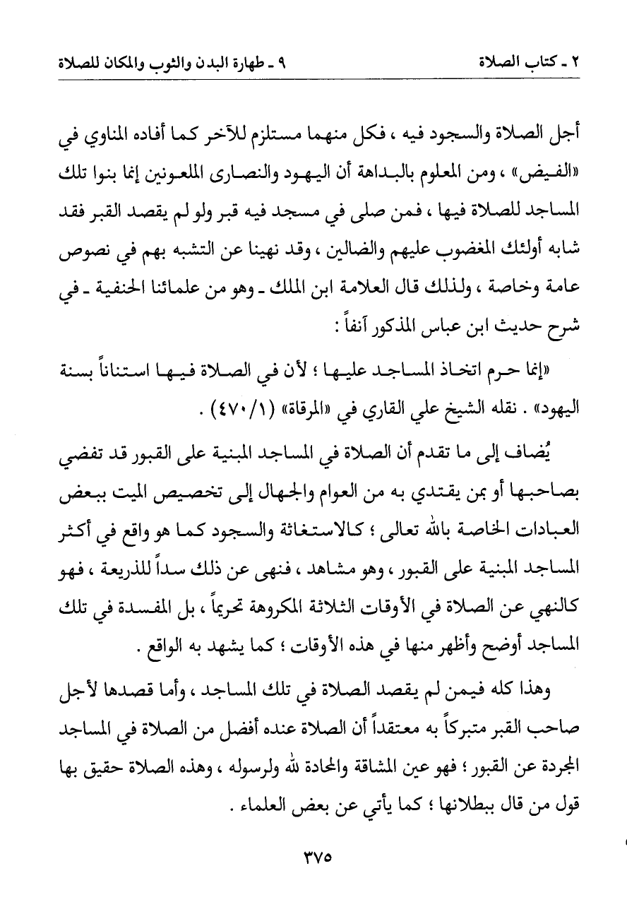 أجل الصلاة والسجود فيه فكل منهما مستلزم للآخر كما أفاده المناوي في (الفيض) ومن المعلوم بالبداهة أن اليهود والنصارى الملعونين إنما بنوا تلك المساجد للصلاة فيها فمن صلى في مسجد فيه قبر ولو لم يقصد القبر فقد شابه أولئك المغضوب عليهم والضالين وقد نهينا عن التشبه بهم في نصوص عامة وخاصة ولذلك قال العلامة ابن الملك - وهو من علمائنا الحنفية - في شرح حديث ابن عباس المذكور آنفا: