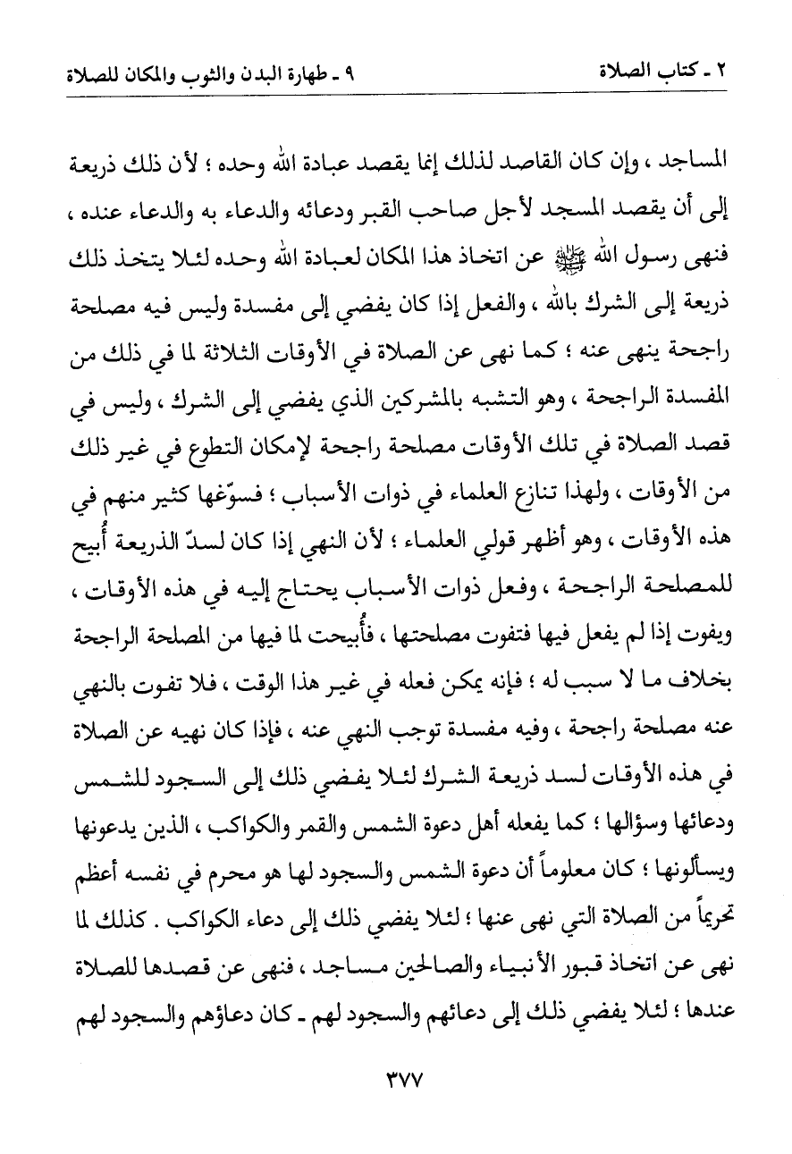 المساجد وإن كان القاصد لذلك إنما يقصد عبادة الله وحده لأن ذلك ذريعة إلى أن يقصد المسجد لأجل صاحب القبر ودعائه والدعاء به والدعاء عنده فنهى رسول الله صلى الله عليه وسلم عن اتخاذ هذا المكان لعبادة الله وحده لئلا يتخذ ذلك ذريعة ينهى عنه كما نهى عن الصلاة في الأوقات الثلاثة لما في ذلك من المفسدة الراجحة وهو التشبه بالمشركين الذي يفضي إلى الشرك وليس في قصد الصلاة في تلك الأوقات ولهذا تنازع العلماء في ذوات الأسباب فسوغها كثير منهم في هذه الأوقات وهو أظهر قولي العلماء لأن النهي إذا كان لسد الذريعة أبيح للمصلحة الراجحة وفعل ذوات الأسباب يحتاج إليه في هذه الأوقات ويفوت إذا لم يفعل فيها فتفوت مصلحتها فأبيحت لما فيها من المصلحة الراجحة بخلاف ما لا سبب له فإنه يمكن فعله في غير هذه الأوقات فلا تفوت بالنهي عنه مصلحة راجحة وفيه مفسدة توجب النهي عنه فإذا كان نهيه عن الصلاة في هذه الأوقات لسد ذريعة الشرك لئلا يفضي ذلك إلى السجود للشمس ودعائها وسؤالها كما يفعله أهل دعوة الشمس والقمر والكواكب الذي يدعونها ويسألونها كان معلوما أن دعوة الشمس والسجود لها هو محرم في نفسه أعظم تحريما من الصلاة التي نهى عنها لئلا يفضي ذلك إلى دعاء الكواكب. كذلك لما نهى عن اتخاذ قبور الأنبياء والصالحين مساجد فنهى عن قصدها للصلاة عندها لئلا يفضي ذلك إلى دعائهم والسجود لهم - كان دعاؤهم والسجود لهم