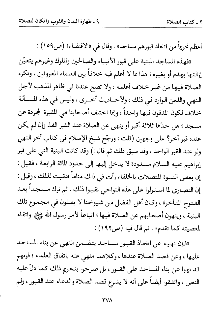(فهذه المساجد المبنية على قبور الأنبياء والصالحين والملوك وغيرهم يتعين إزالتها بهدم أو بغيره وهذا ما لا أعلم فيه خلافا بين العلماء المعروفين وتكره الصلاة فيها من غير خلاف أعلمه ولا تصح عندنا في ظاهر المذهب لأجل النهي واللعن الوارد في ذلك ولأحاديث أخرى وليس في هذه المسألة خلاف لكون المدفون فيها واحدا وإنما اختلف أصحابنا في المقبرة المجردة عن مسجد هل حددها ثلاثة أقبر أو ينهى عن الصلاة عن القبر الفذ وإن لم يكن عنده قبر آخر؟ على وجهين (قلت: ورجح شيخ الإسلام في كتاب آخر النهي ولو عند القبر الواحد وقد سبق ذلك ثم قال:) وقد كانت البينة التي على قبر إبراهيم عليه السلام مسدودة لا يدخل إليها إلى حدود المائة الرابعة فقيل: إن بعض النسوة المتصلات بالخلفاء رأت في ذلك مناما فنقبت لذلك وقيل: إن النصارى لما استولوا على هذه النواحي نقبوا ذلك ثم ترك مسجدا بعد الفتوح المتأخرة وكان أهل الفضل من شيوخنا لا يصلون في مجموع تلك البنية وينهون أصحابهم عن الصلاة فيها اتباعا لأمر رسول الله صلى الله عليه وسلم واتقاء لمعصيته كما تقدم). ثم قال فيه: