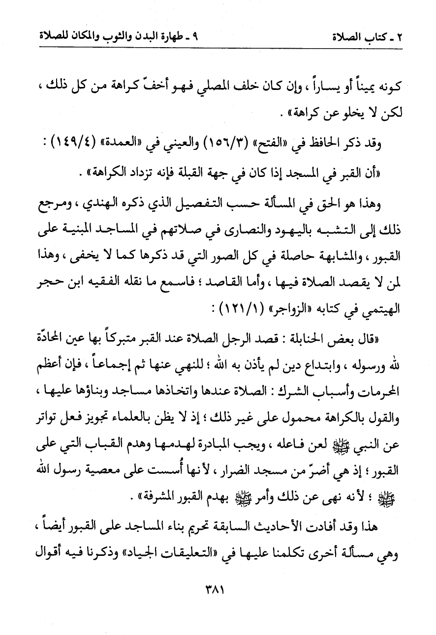 وهذا هو الحق في المسألة حسب التفصيل الذي ذكره الهندي ومرجع ذلك إلى التشبه باليهود والنصارى في صلاتهم في المساجد المبنية على القبور والمشابهة حاصله في كل الصور التي قد ذكرها كما لا يخفى وهذا لمن لا يقصد الصلاة فيها وأما القاصد فاسمع ما نقله الفقيه ابن حجر الهيتمي في كتابه (الزواجر):