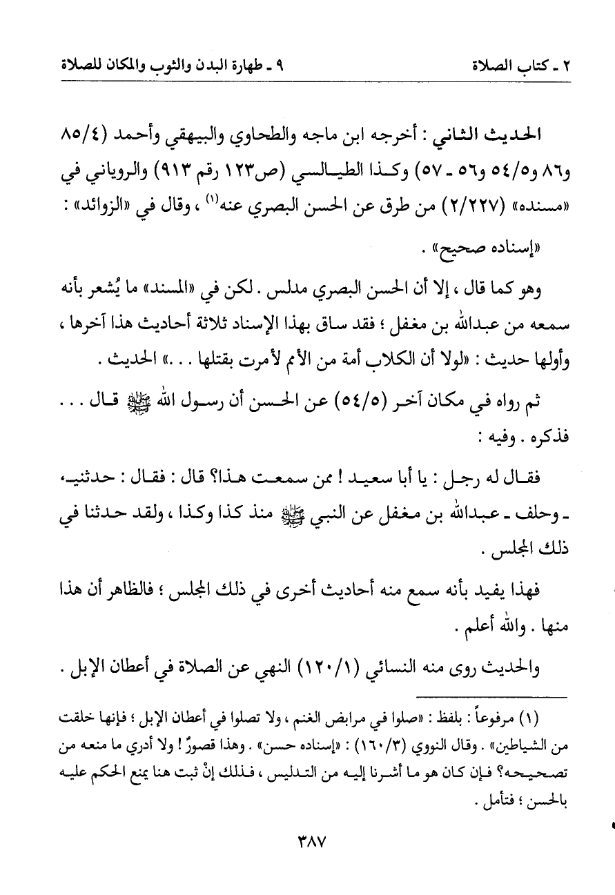 (1) مرفوعا: بلفظ: (صلوا في مرابض الغنم ولا تصلوا في أعطان الإبل فإنها خلقت من الشياطين). وقال النووي (3/ 160): (إسناده حسن). وهذا قصور ولا أدري ما منعه من تصحيحه؟ فإن كان هو ما أشرنا إليه من التدليس فذلك إن ثبت هنا يمنع الحكم عليه بالحسن فتأمل