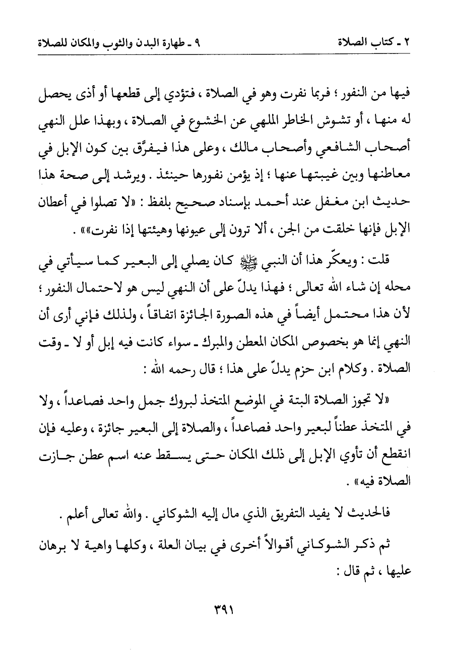 قلت: ويعكر هذا أن النبي صلى الله عليه وسلم كان يصلي إلى البعير كما سيأتي في محله إن شاء الله تعالى فهذا يدل على أن النهي ليس هو لاحتمال النفور لأن هذا محتمل أيضا في هذه الصورة الجائزة اتفاقا ولذلك فإني أرى أن النهي إنما هو بخصوص المكان المعطن والمبرك - سواء كانت فيه إبل أو لا - وقت الصلاة. وكلام ابن حزم يدل على هذا قال رحمه الله: