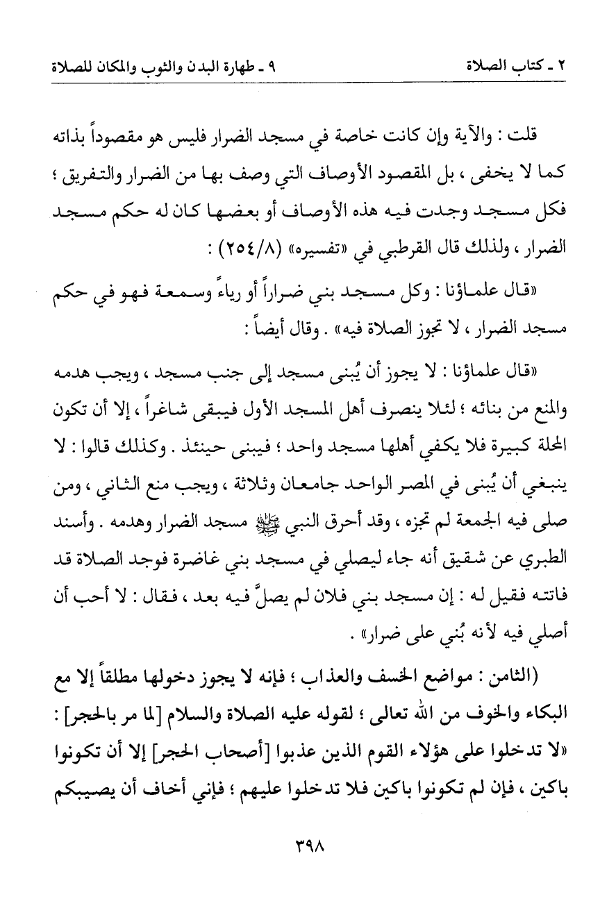 قلت: والآية وإن كانت خاصة في مسجد الضرار فليس هو مقصودا بذاته كما لا يخفى بل المقصود الأوصاف التي وصف بها من الضرار والتفريق فكل مسجد وجدت فيه هذه الأوصاف أو بعضها كان له حكم مسجد الضرار ولذلك قال القرطبي في (تفسيره):