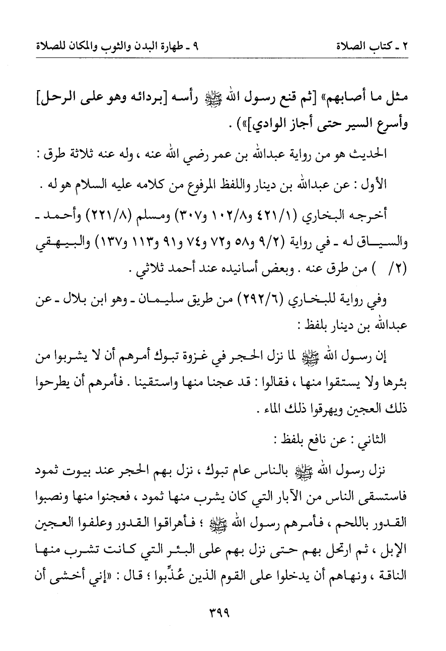 نزل رسول الله صلى الله عليه وسلم بالناس عام تبوك نزل بهم الحجر عند بيوت ثمود فاستسقى الناس من الآبار التي كان يشرب منها ثمود فعجنوا منها ونصبوا القدور باللحم فأمرهم رسول الله صلى الله عليه وسلم فأهرقوا وعلفوا العجين الإبل ثم ارتحل بهم حتى نزل بهم على البئر التي كان تشرب منها الناقة ونهاهم أن يدخلوا على القوم الذين عذبوا قال: (إني أخشى أن