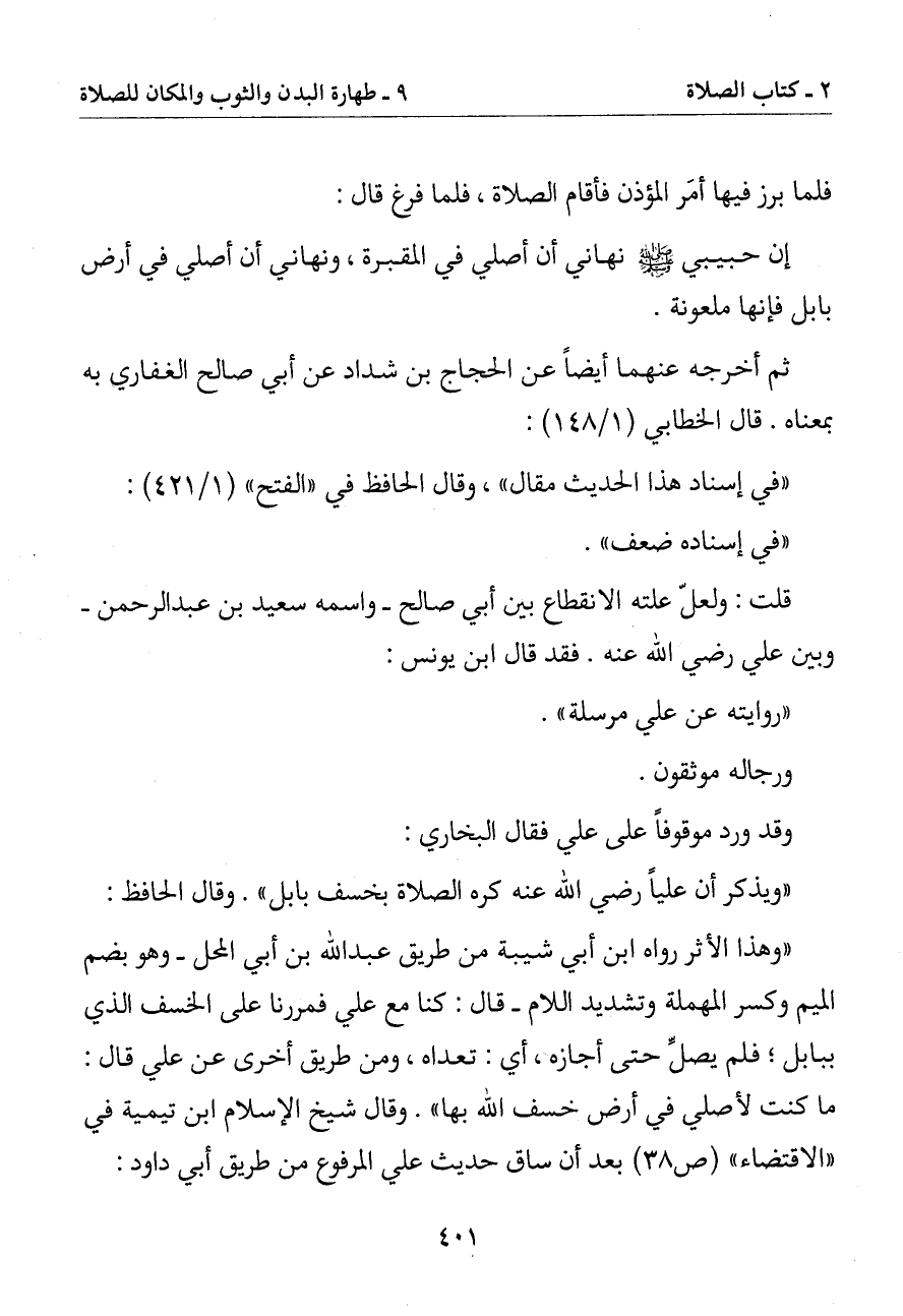 (وهذا الأثر رواه ابن أبي شيبة من طريق عبد الله بن أبي الملح - وهو بضم الميم وكسر المهملة وتشديد اللام - قال: كنا مع علي فمررنا على الخسف الذي ببابل فلم يصل حتى أجازه أي: تعداه ومن طريق أخرى عن علي قال: ما كنت لأصلي في أرض خسف الله بها). وقال شيخ الإسلام ابن تيمية في (الاقتضاء) بعد أن ساق حديث علي المرفوع من طريق أبي داود: