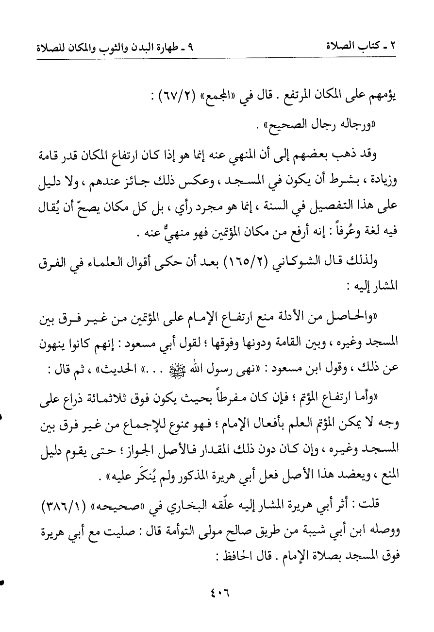 وقد ذهب بعضهم إلى أن المنهي عنه إنما هو إذا كان ارتفاع المكان قدر قامة وزيادة بشرط أن يكون في المسجد وعكس ذلك جائز عندهم ولا دليل على هذا التفصيل في السنة إنما هو مجرد رأي بل كل مكان يصح أن يقال فيه لغة وعرفا: إنه أرفع من مكان المؤتمين فهو منهي عنه