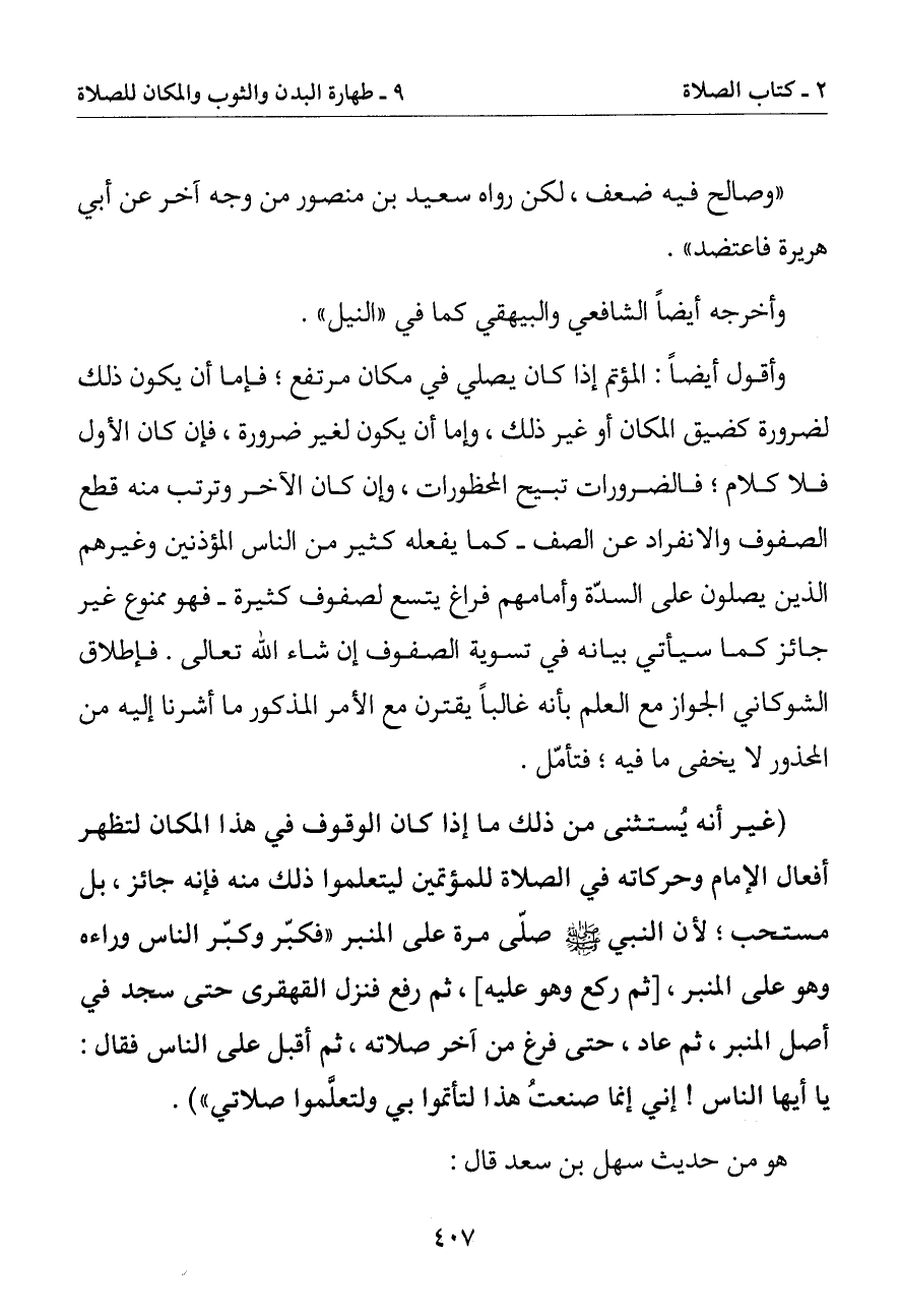 وأقول أيضا: المؤتم إذا كان يصلي في مكان مرتفع فإما أن يكون ذلك لضرورة كضيق المكان أو غير ذلك وإما أن يكون لغير ضرورة فإن كان الأول فلا كلام فالضرورات تبيح المحظورات وإن كان الآخر وترتب منه قطع الصفوف والانفراد عن الصف - كما يفعله كثير من الناس المؤذنين وغيرهم والذين يصلون على السدة وأمامهم فراغ يتسع لصفوف كثير - فهو ممنوع غير جائز كما سيأتي بيانه في تسوية الصفوف