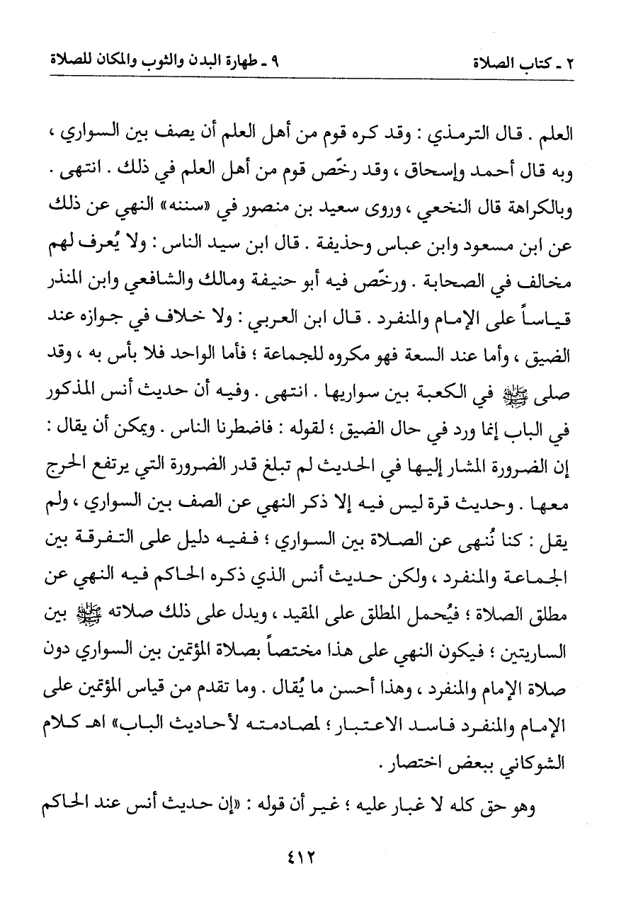 العلم. قال الترمذي: وكره قوم من أهل العلم أن يصف بين السواري وبه قال أحمد وإسحاق وقد رخص قوم من أهل العلم في ذلك. انتهى